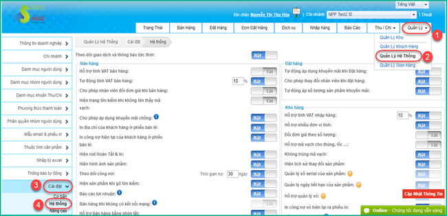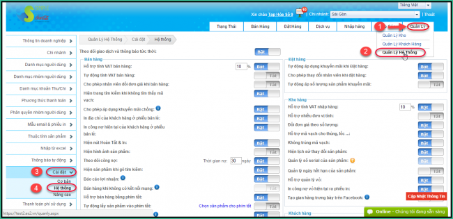 Đăng nhập S3, vào thẻ Quản Lý >> Quản Lý Hệ Thống >> Cài Đặt >> Hệ Thống