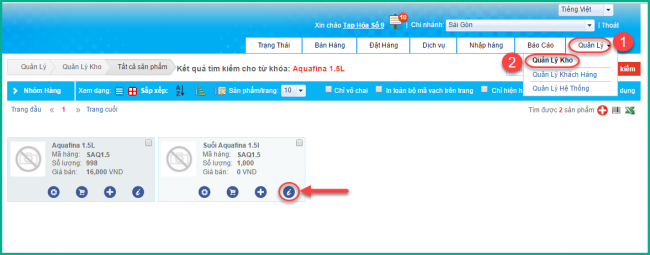 Vào thẻ Quản Lý >> Quản Lý Kho >> Bấm vào biểu tượng chữ “i” của sản phẩm đó