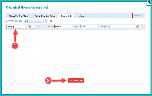 Để tạo Nhiều đơn vị tính cho một sản phẩm, trước tiên bạn phải thiết lập danh sách các đơn vị tính được sử dụng của sản phẩm đó. Bạn thực hiện theo hướng dẫn tại đây.