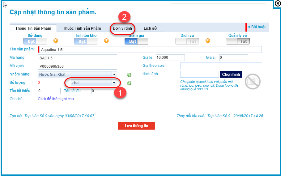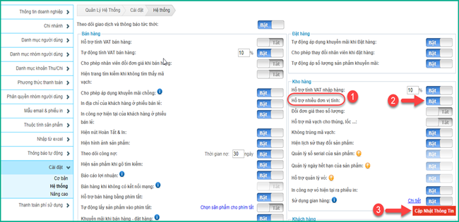 Chọn Bật “Hỗ trợ nhiều đơn vị tính” >> Cập Nhật Thông Tin