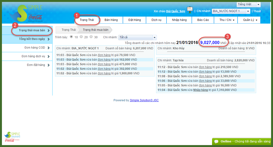Để xem nhanh và đơn giản, bạn vào Trạng Thái >> Trạng thái mua bán >> xem Tổng doanh số (các chi nhánh) hôm nay