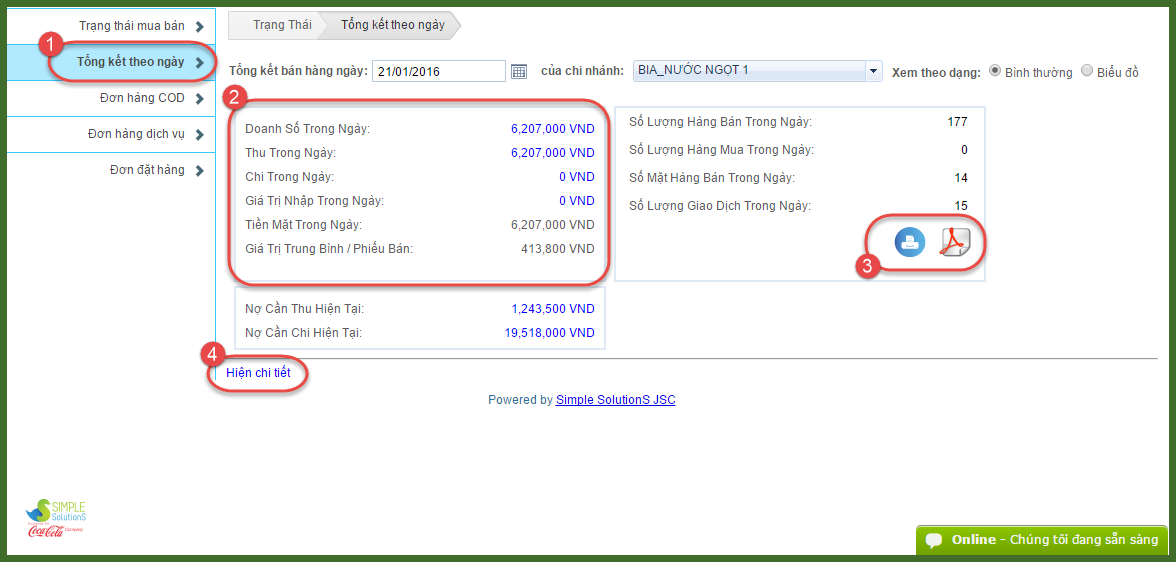 # Tại vị trí số 3, khi bấm vào bạn có thể chọn in hoặc xuất tập tin pdf cho báo cáo trong ngày của mình.
