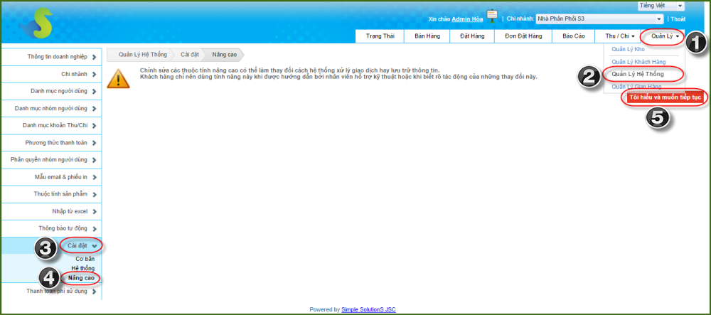 Vào Quản lý >> Quản lý hệ thống >> Cài đặt >> Nâng cao >> Tôi hiểu và muốn tiếp tục