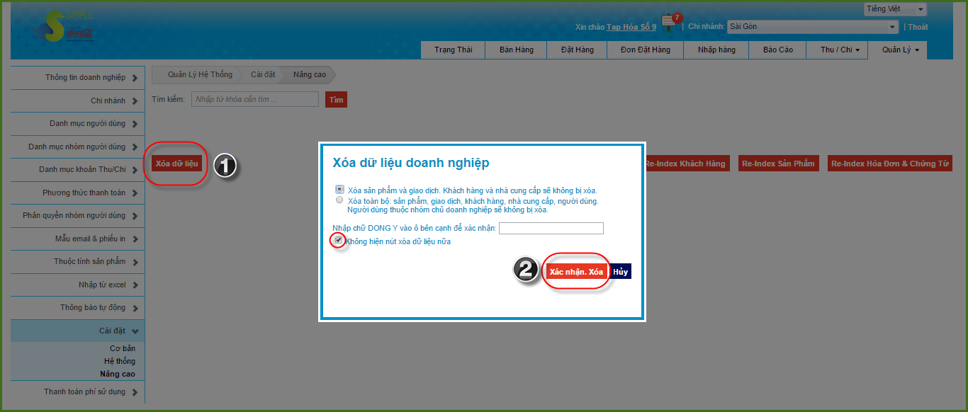 Bước 1: Nhìn bên góc tay trái nhấp chuột và nút Xóa dữ liệu >> Cửa sổ hiện ra >> Đọc kỹ các hướng dẫn để thực thực hiện chọn xóa các dữ liệu >> Nhập chữ DONG Y >> Xác nhận Xóa