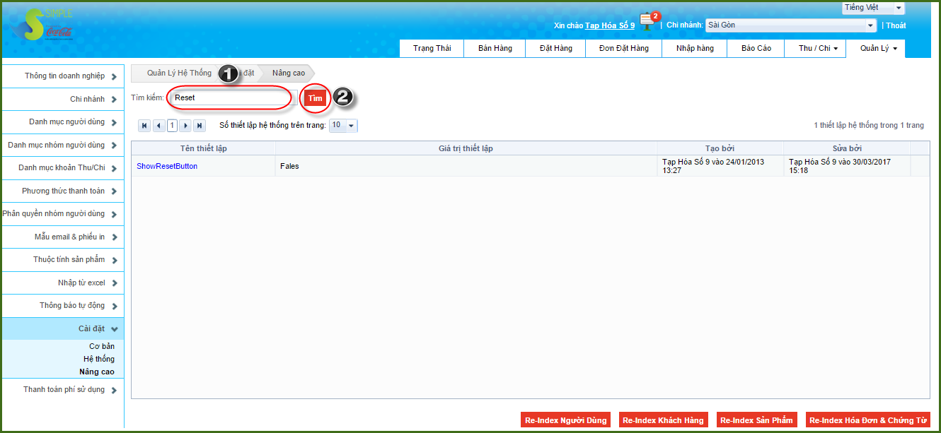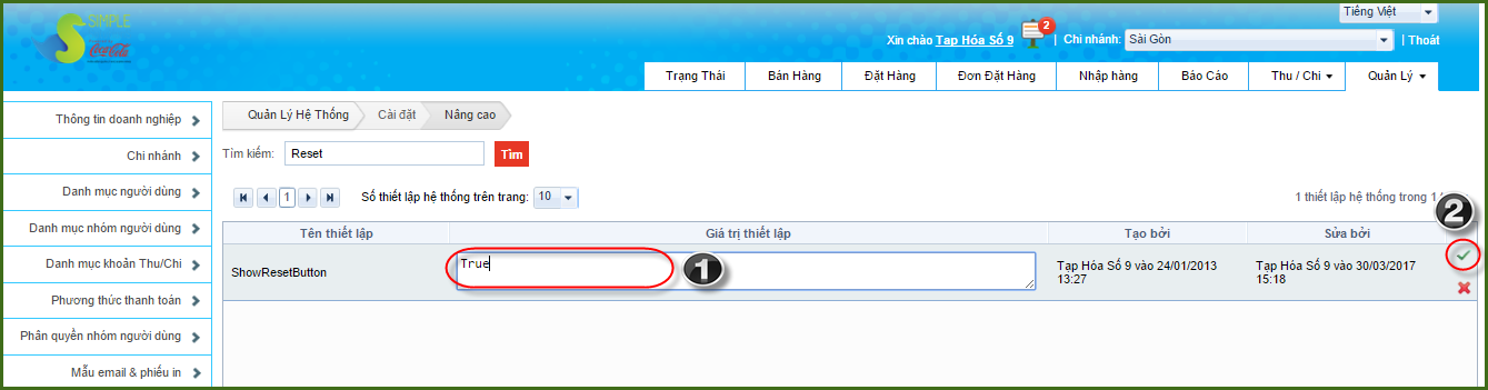Bước 2: Nhấp chuột vào chữ ShowResetButton >> Đổi chữ Fales thành chữ True >> Bấm vào dấu tích màu xanh bên góc tay phải để lưu lại.