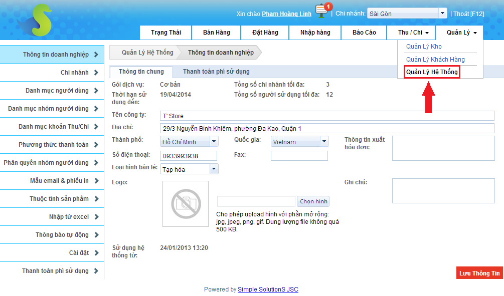 Đăng nhập tài khoản S3, vào thẻ Quản Lý >> Quản Lý Hệ Thống