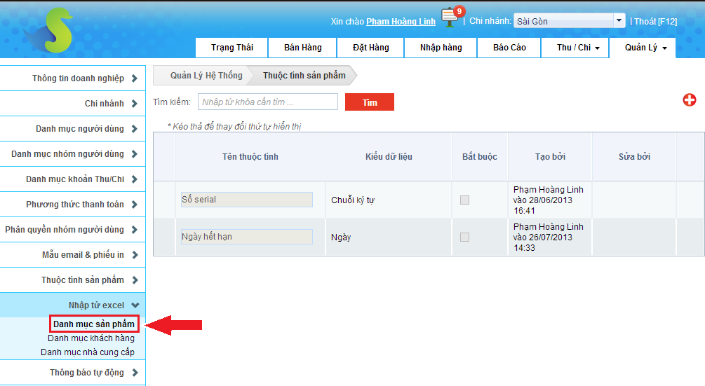 Chọn mục Nhập từ Excel >> Danh mục sản phẩm