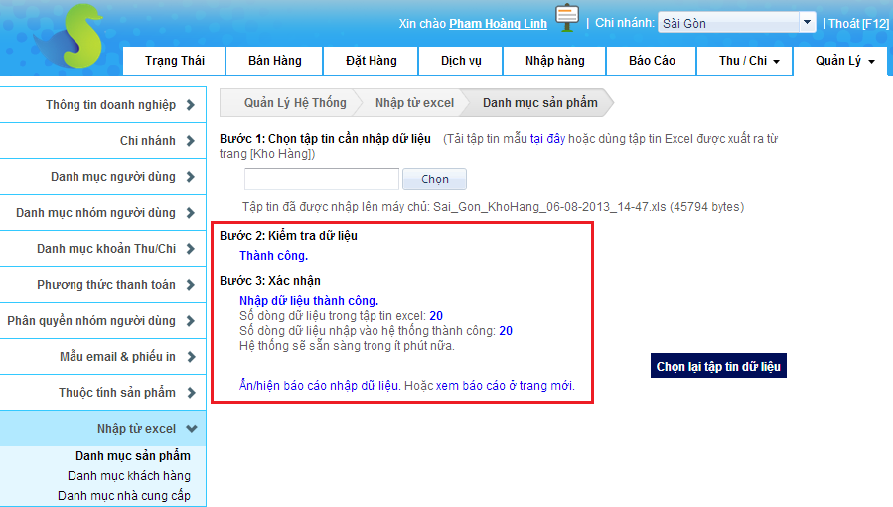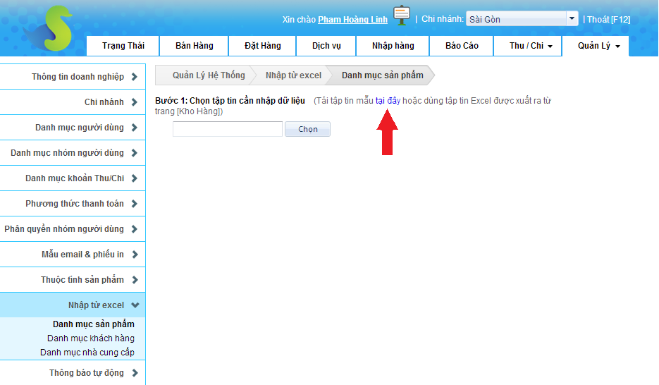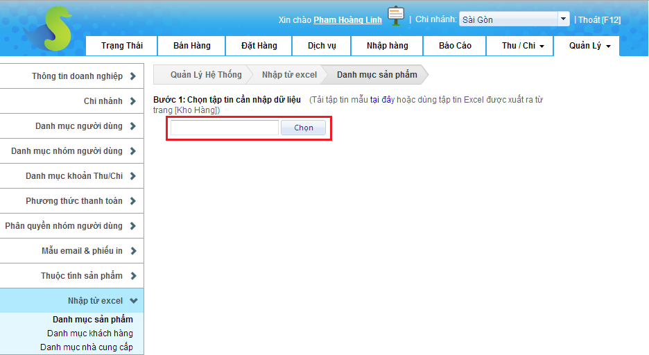 Sau khi lưu lại thông tin đã nhập trên Excel, vào lại phần mềm. Bạn vào Quản lý >> Quản lý hệ thống >> Nhập từ Excel >> Danh mục sản phẩm >> Bấm nút Chọn để tìm và tải file Excel lên phần mềm.