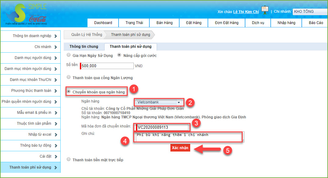 Để thực hiện ghi nhận mức phí bù khi nâng chi nhánh hoặc thêm người sử dụng, bạn thực hiện theo các bước đơn giản sau nhé: