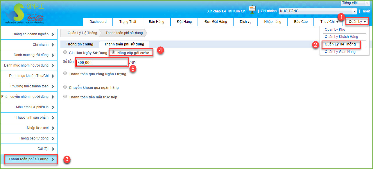 # Vào Quản lý >> Quản lý hệ thống >> Thanh toán phí sử dụng >> Chọn Nâng cấp gói cước >> Ghi nhận số tiền mà bạn đã thanh toán.