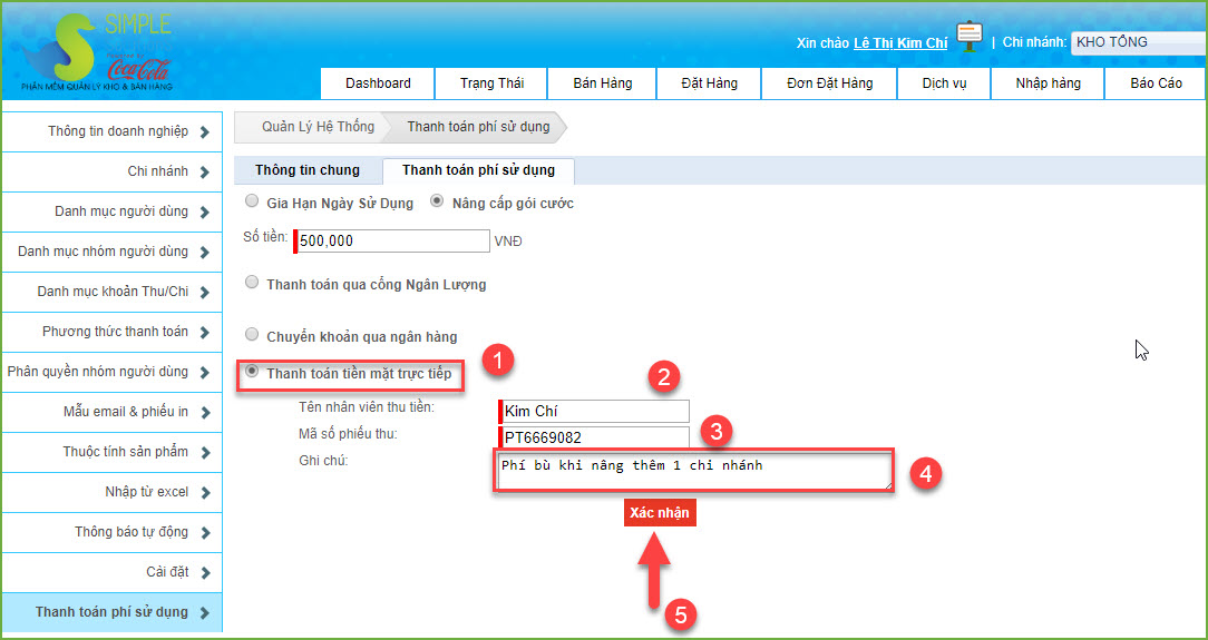 Chọn Thanh toán tiền mặt trực tiếp >> lần lượt nhập các thông tin cần thiết: Tên nhân viên thu tiền, mã số phiếu thu, ghi chú >> Xác nhận.