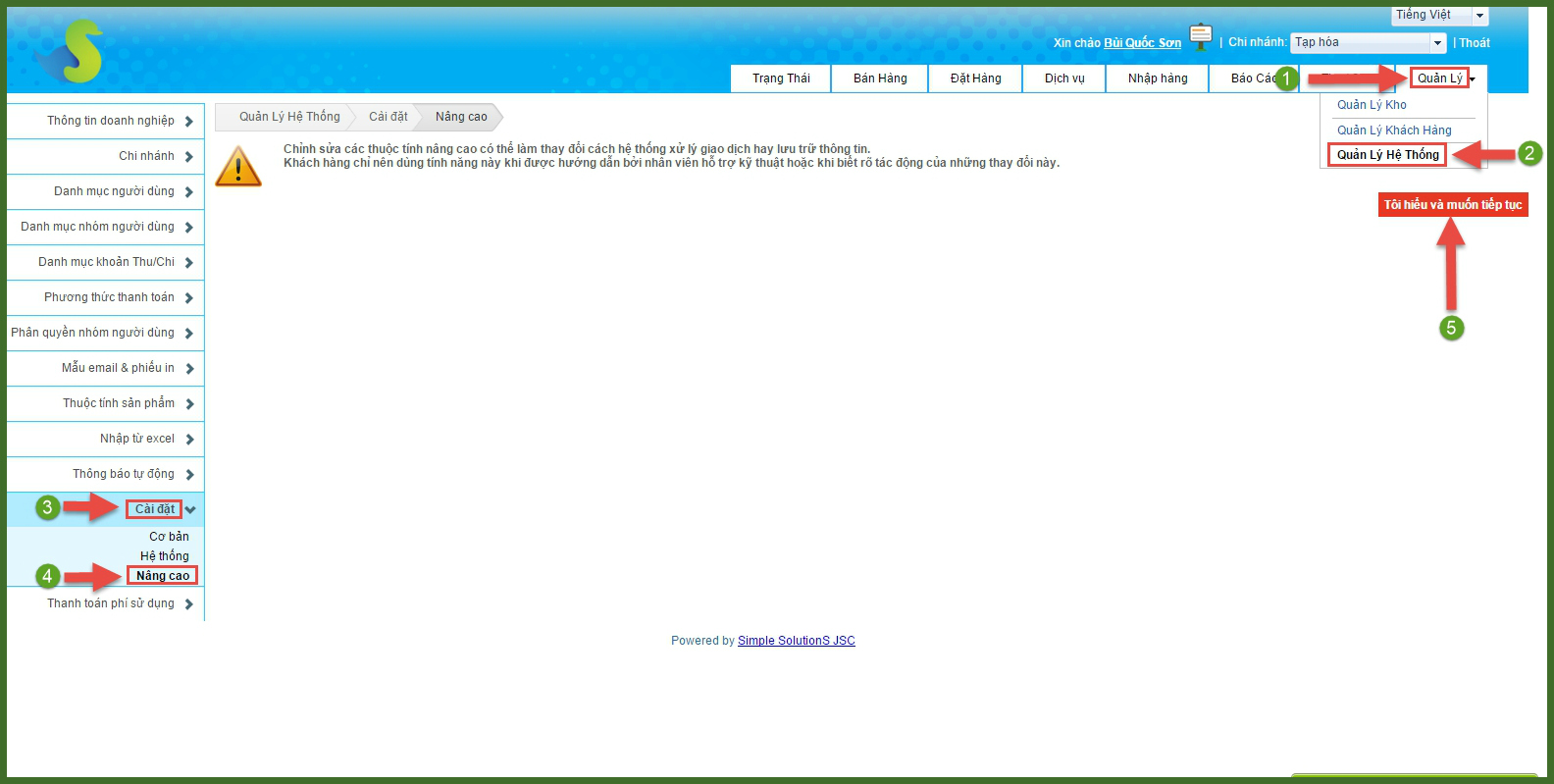 Vào Quản lý >> Quản lý hệ thống >> Cài đặt >> Nâng cao >> Tôi hiểu và muốn tiếp tục