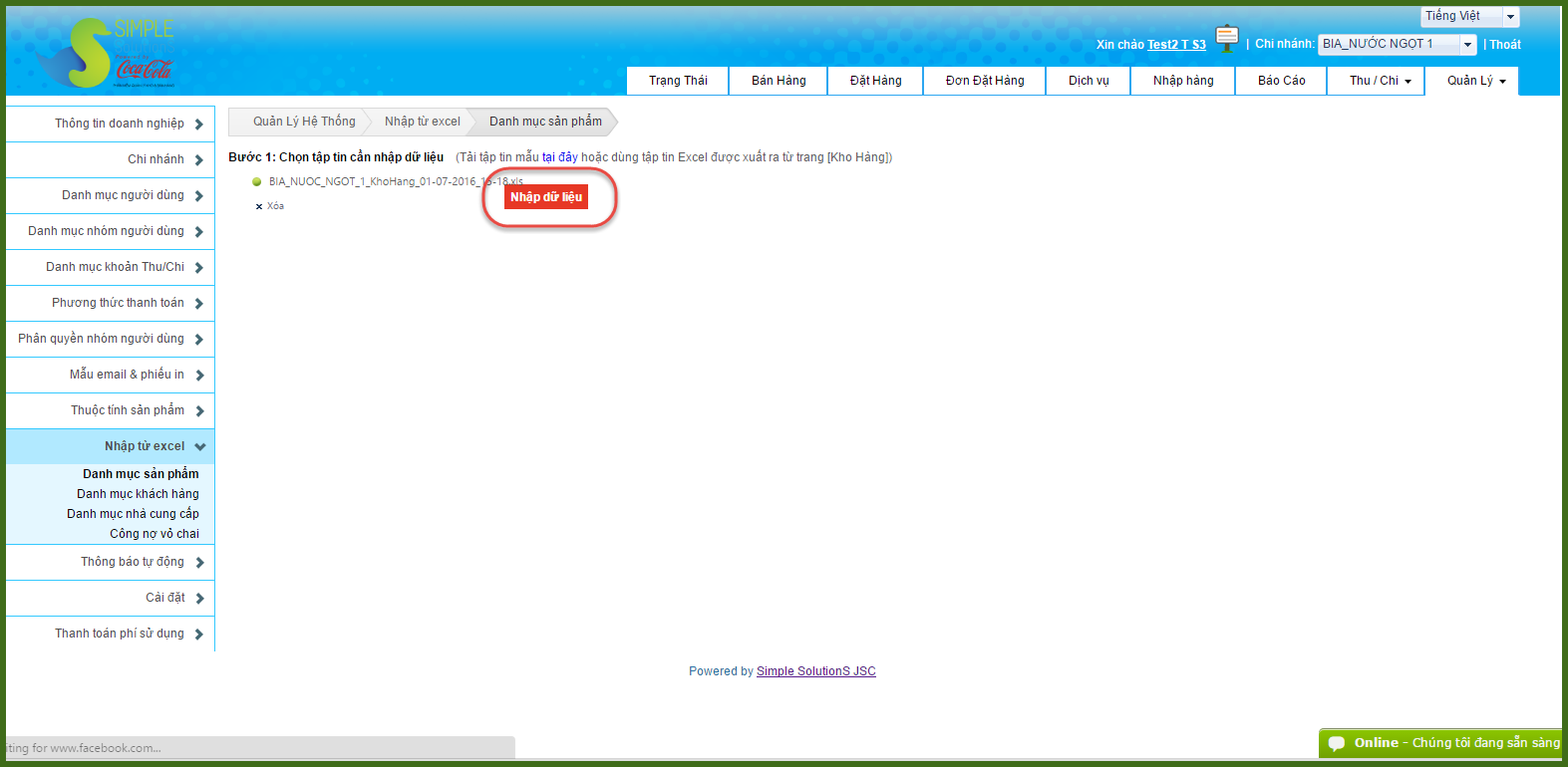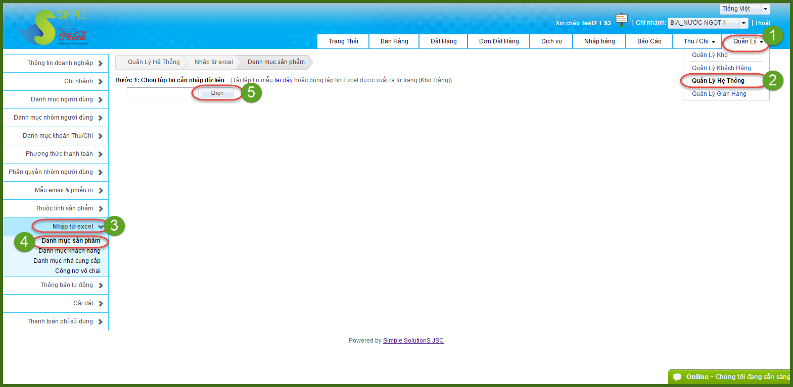 + Vào Quản lý >> Quản lý hệ thống >> Nhập từ excel >> Danh mục sản phẩm >> Bấm nút Chọn để tìm file vừa lưu bên trên