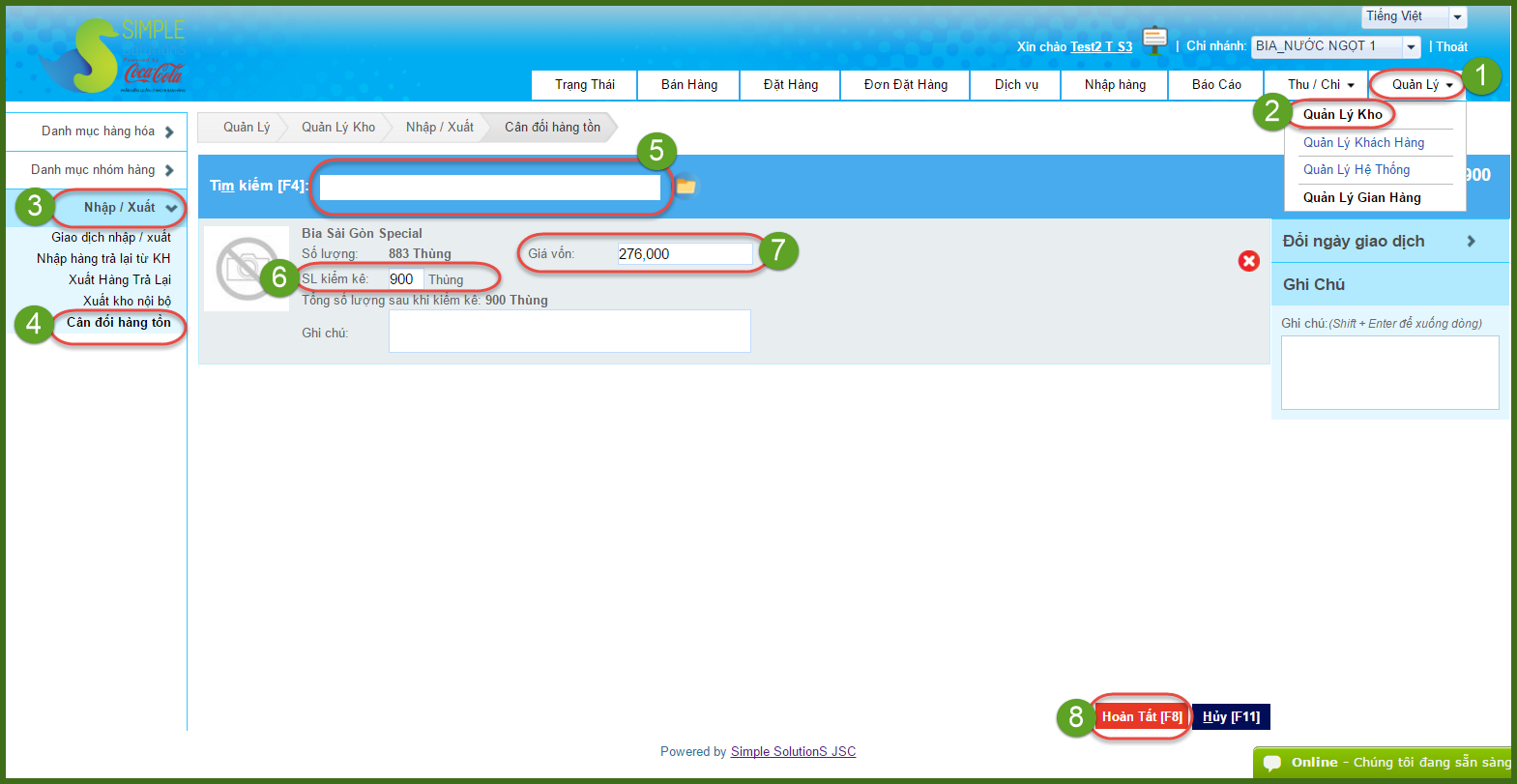 + Vào Quản lý >> Quản lý kho >> Nhập/xuất >> Cân đối hàng tồn >> Tìm và chọn sản phẩm hoặc quét mã vạch sản phẩm >> Lần lượt nhập số lượng, giá vốn >> Bấm Hoàn tất, kết thúc giao dịch.