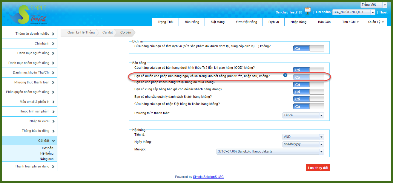 Bạn có thể dễ dàng tìm thấy nút “Cho phép bán hàng ngay cả khi trong kho hết hàng” trong phần Cài đặt >> Cơ bản như hình dưới đây: