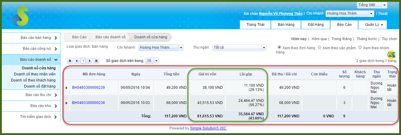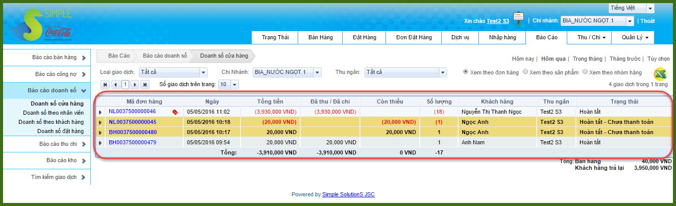 Hình 1.2. Báo cáo doanh số khi BẬT tính năng bán âm