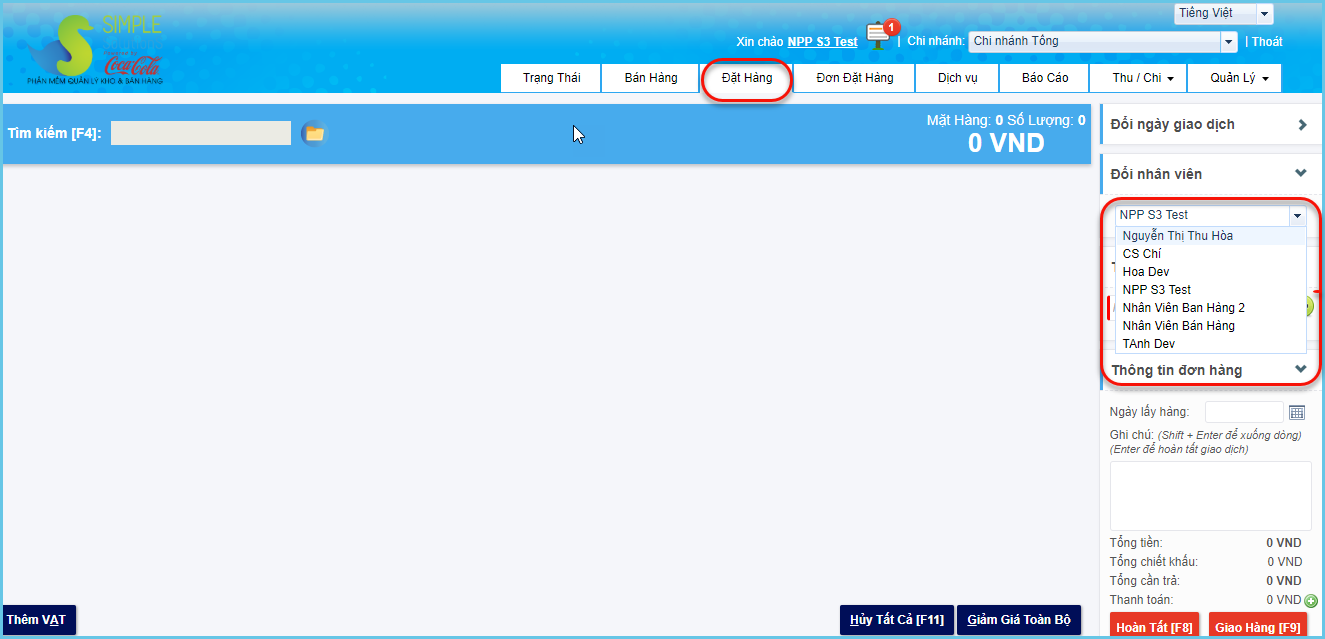 Đăng nhập vào phần mềm S3POS, chọn thẻ Đặt hàng >> Tìm và Chọn nhân viên bán tại ô Đổi nhân viên