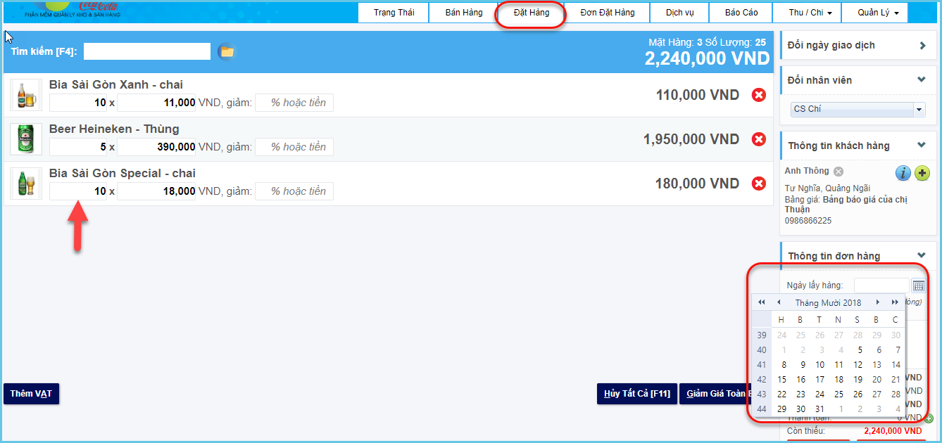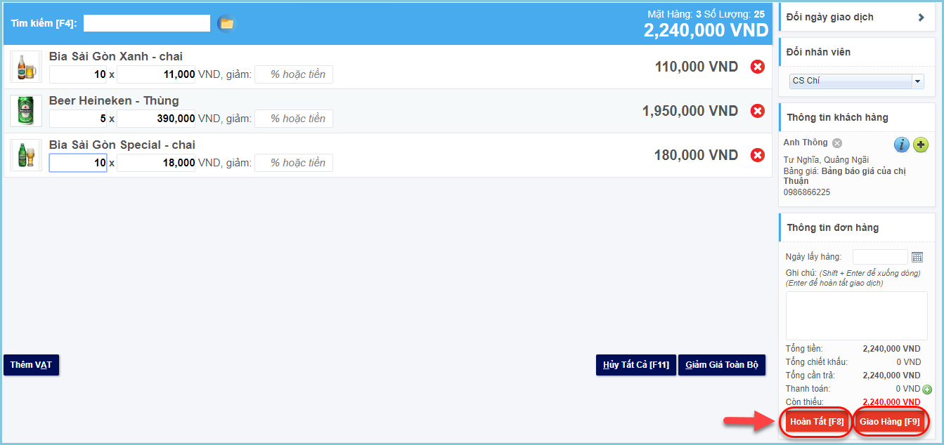 Tìm và chọn thông tin khách hàng theo Tên, Điện thoại, Địa chỉ trong ô Thông tin khách hàng