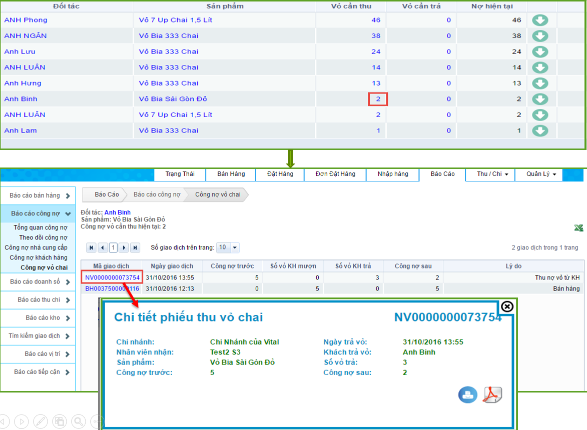 Đồng thời có thể nhấp chuột vào Mã giao dịch để xem chi tiết các Phiếu thu vỏ chai, Phiếu trả vỏ chai.