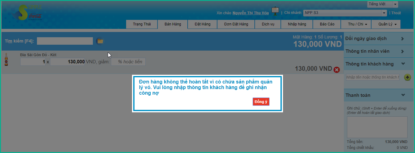 Lưu ý: khi thao tác bán hàng bắt buộc phải chọn Khách hàng, khi không có khách hàng phần mềm sẽ hiện cửa sổ để thông báo