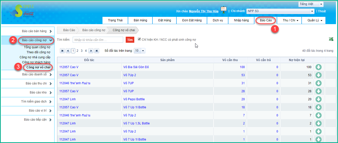 Bước 8: Để xem chi tiết giao dịch Vỏ cần thu, Vỏ cần trả nhấp chuột vào các con số màu xanh (2). Phần mềm sẽ hiển thị chi tiết bao gồm đối tác, sản phẩm, lý do.