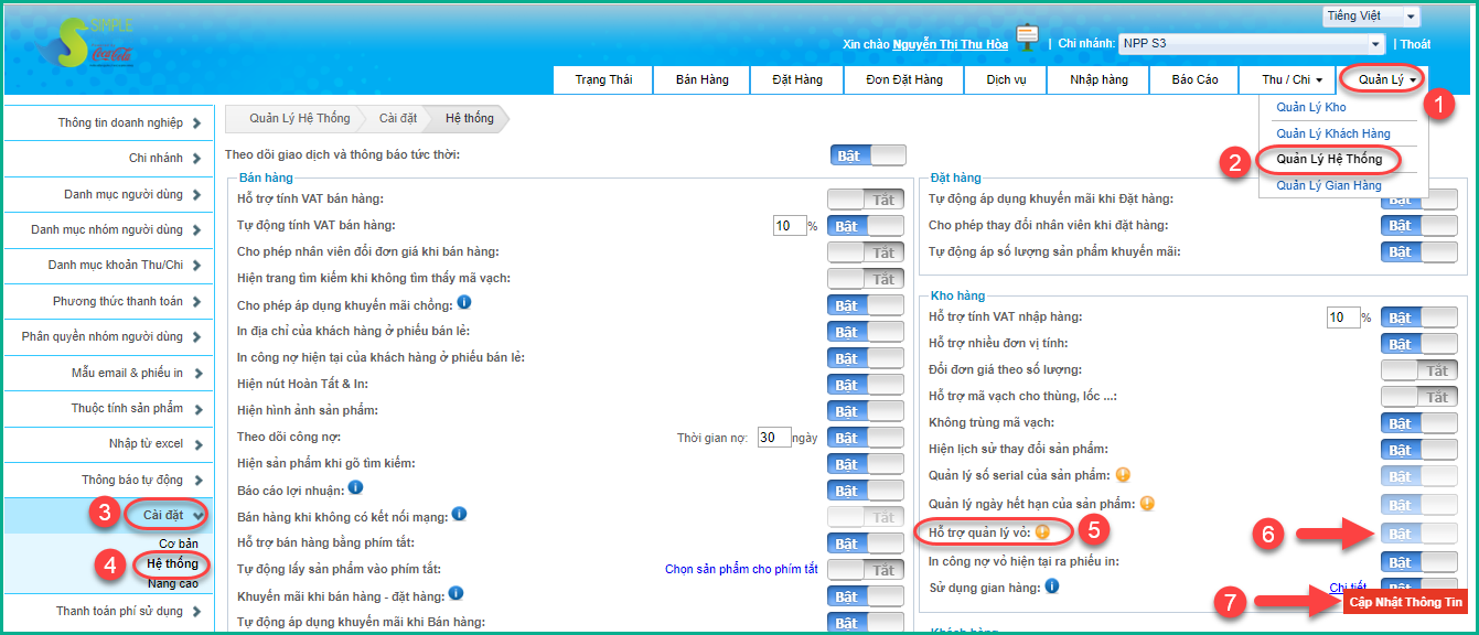 Bước 1: Vào Quản lý >> Quản lý hệ thống >> Cài đặt >> Hệ thống >> Bật Hỗ trợ quản lý vỏ >> Cập nhật thông tin