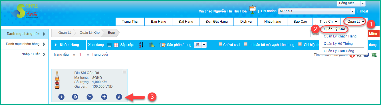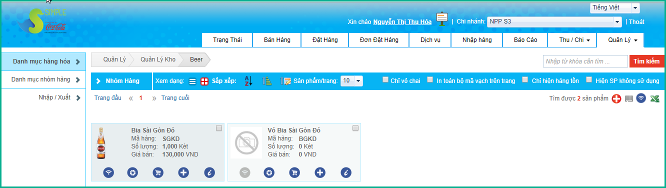 Bước 7: Khi cần thực hiện thao tác thu hồi vỏ chai từ khách hàng hay trả vỏ chai cho nhà cung cấp, nhấp chuột vào biểu tượng