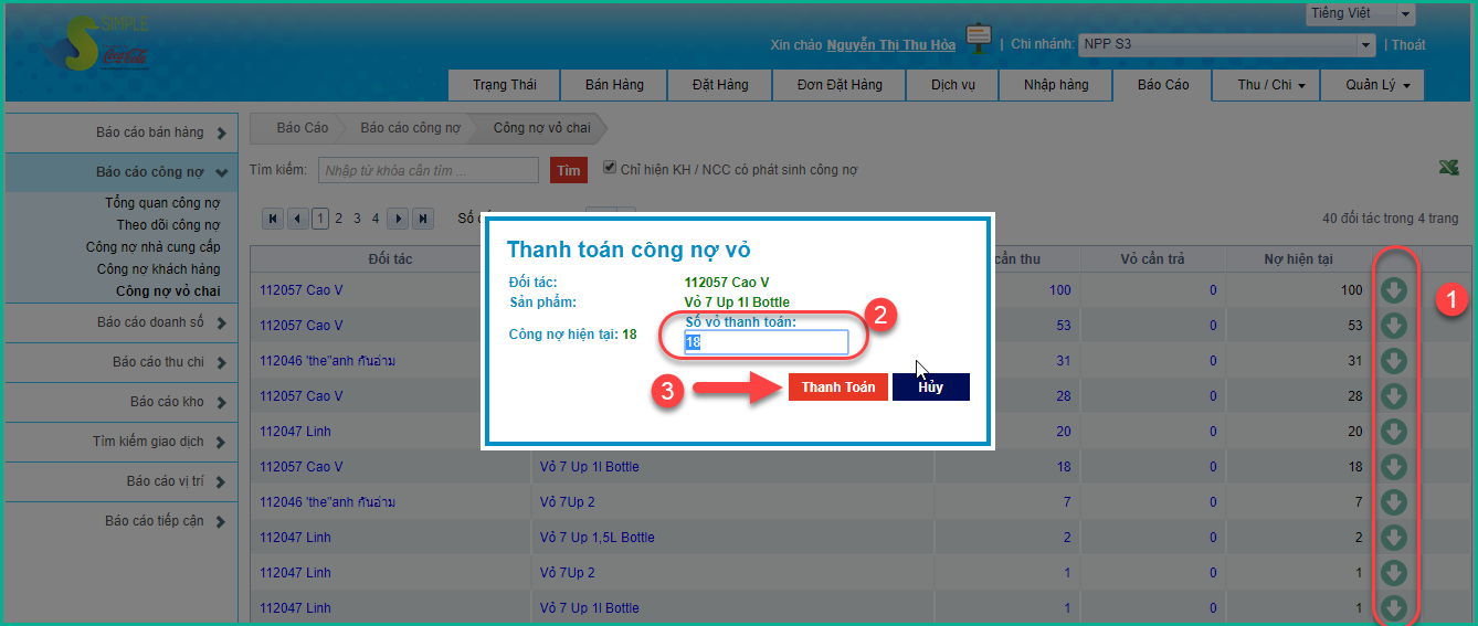 điền số vỏ cần thu hồi hoặc trả nợ nhà cung cấp >> Thanh toán.